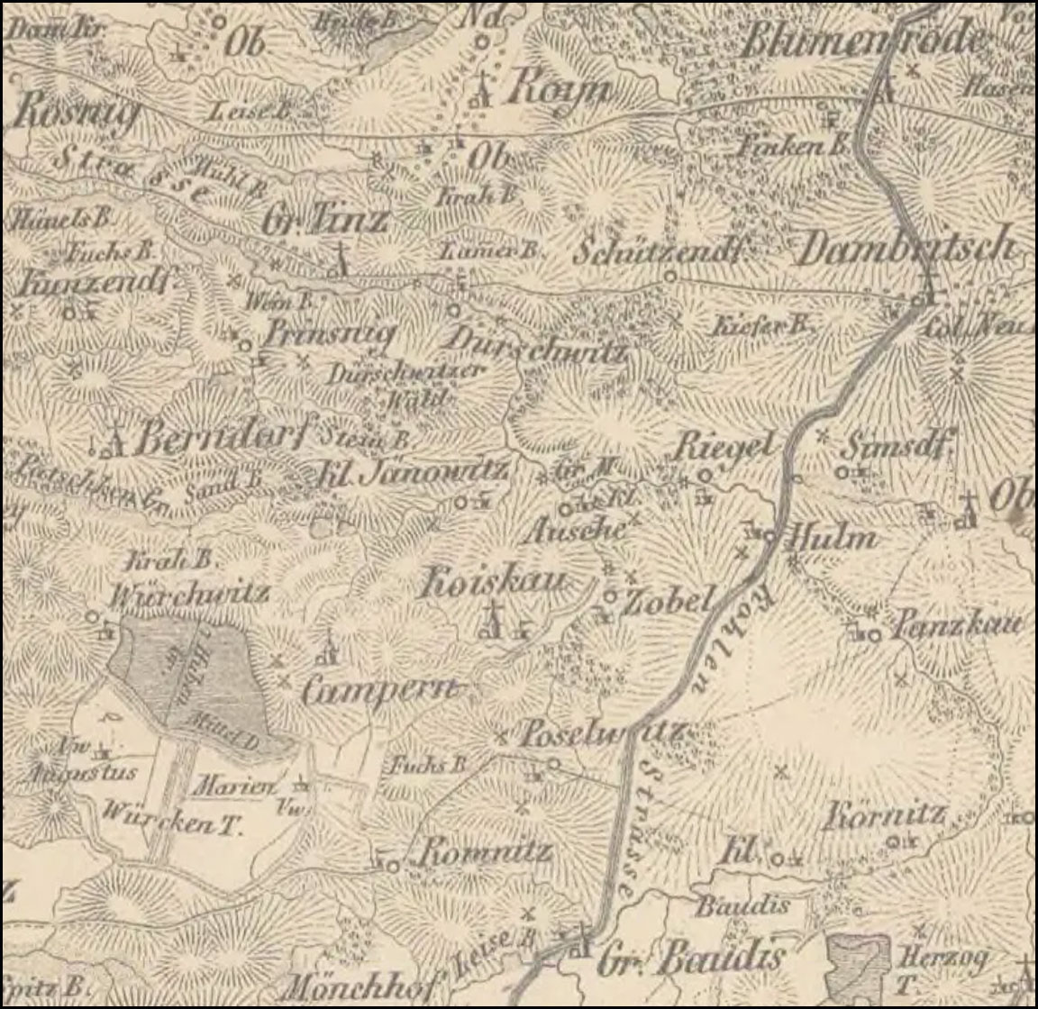 Fragment mapy z ok. 1845 roku na której wyraźnie jest zaznaczona Droga Węglowa (Kohlen Strasse) na odcinku Budziszów Wielki – Kwietno